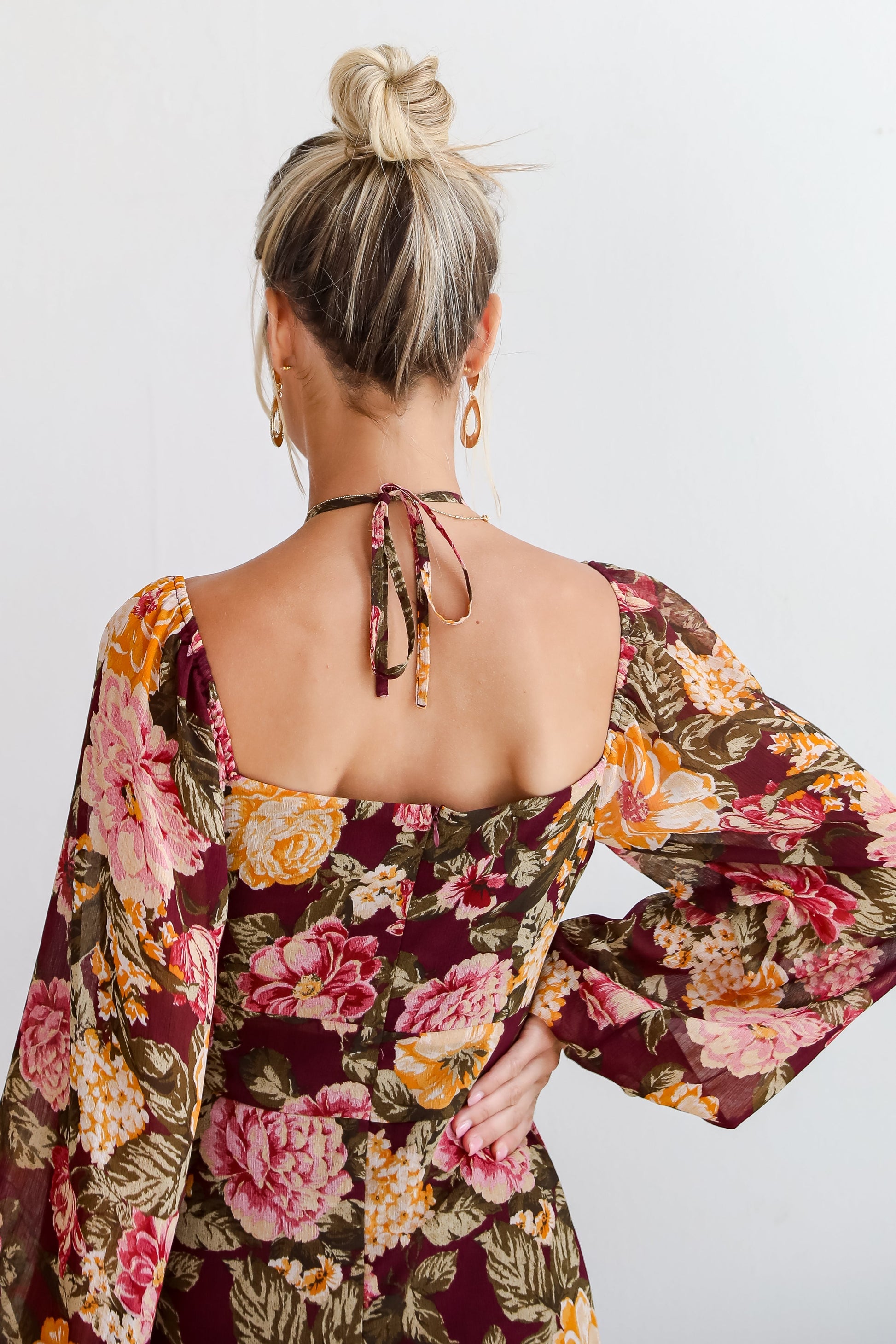 Jaws will drop at the sight of you in the Breathtaking View Plum Floral Maxi Dress! This dress features a rich plum backdrop adorned with delicate floral patterns, creating a striking, feminine look. The flowing maxi length provides a graceful, elongated silhouette, while the long sleeves add a touch of sophistication and warmth for cooler days. Crafted from soft, breathable fabric, it offers both comfort and style. The fitted waist enhances your figure, making it ideal for everything from special occasions to casual gatherings. Pair it with heels or boots for a chic, timeless outfit that transitions effortlessly from day to night!