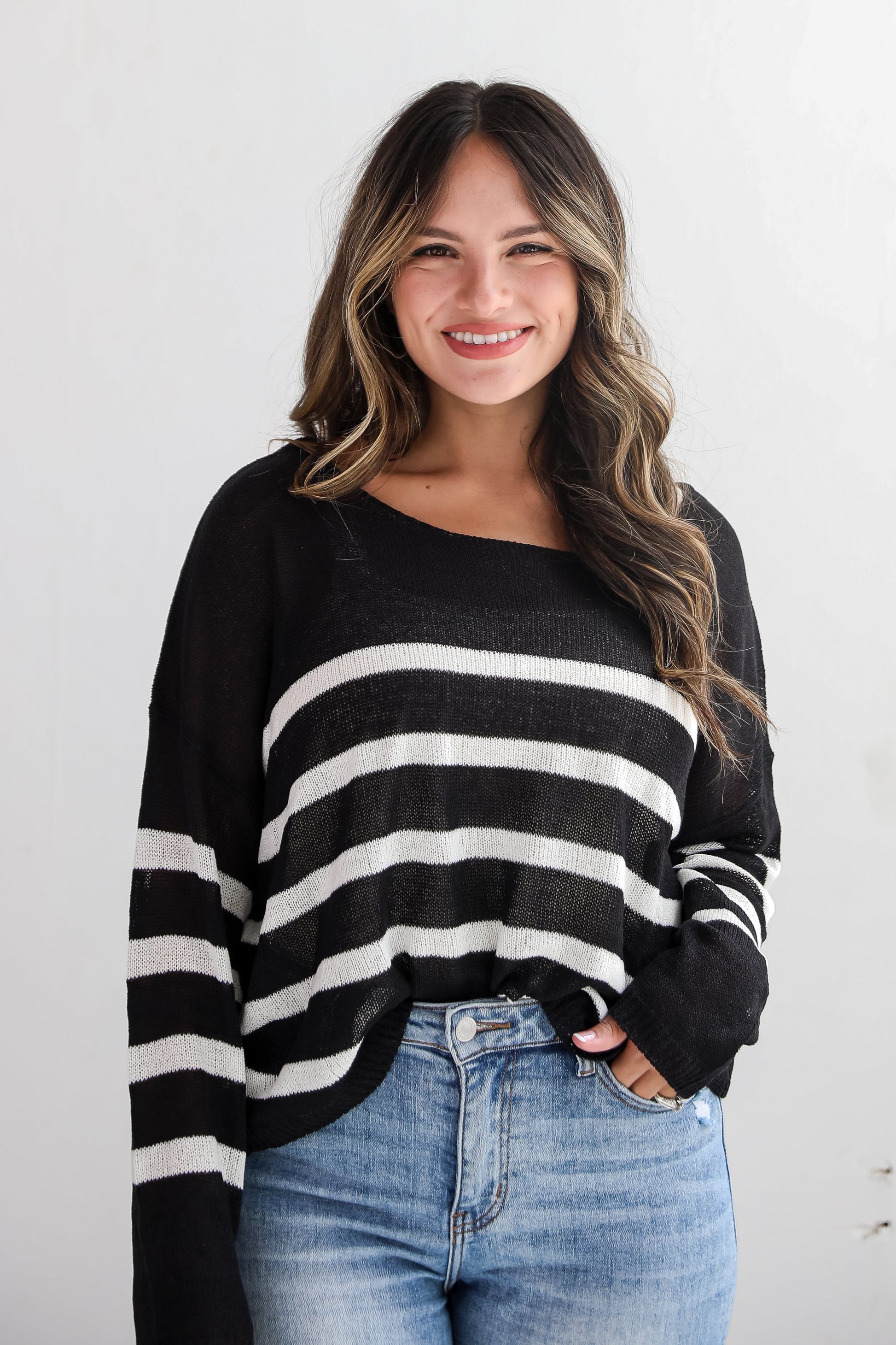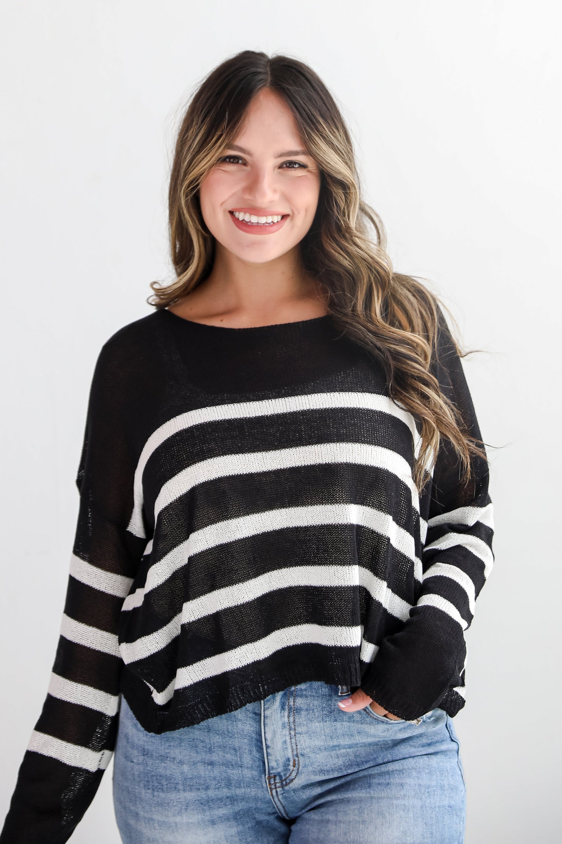 The Stylish Promise Striped Lightweight Knit Sweater is guaranteed to make you a fashion icon wherever you go! This stylish piece combines a sophisticated striped pattern with a lightweight, breathable knit fabric, making it perfect for layering throughout the seasons. The stripes create a timeless look that adds a touch of nautical flair, making it versatile enough to pair with jeans, skirts, or shorts. Ideal for cooler days or transitioning between seasons, this sweater provides warmth without bulk, offering an easy-to-wear option for casual outings or cozying up at home! Available in 2 colors.